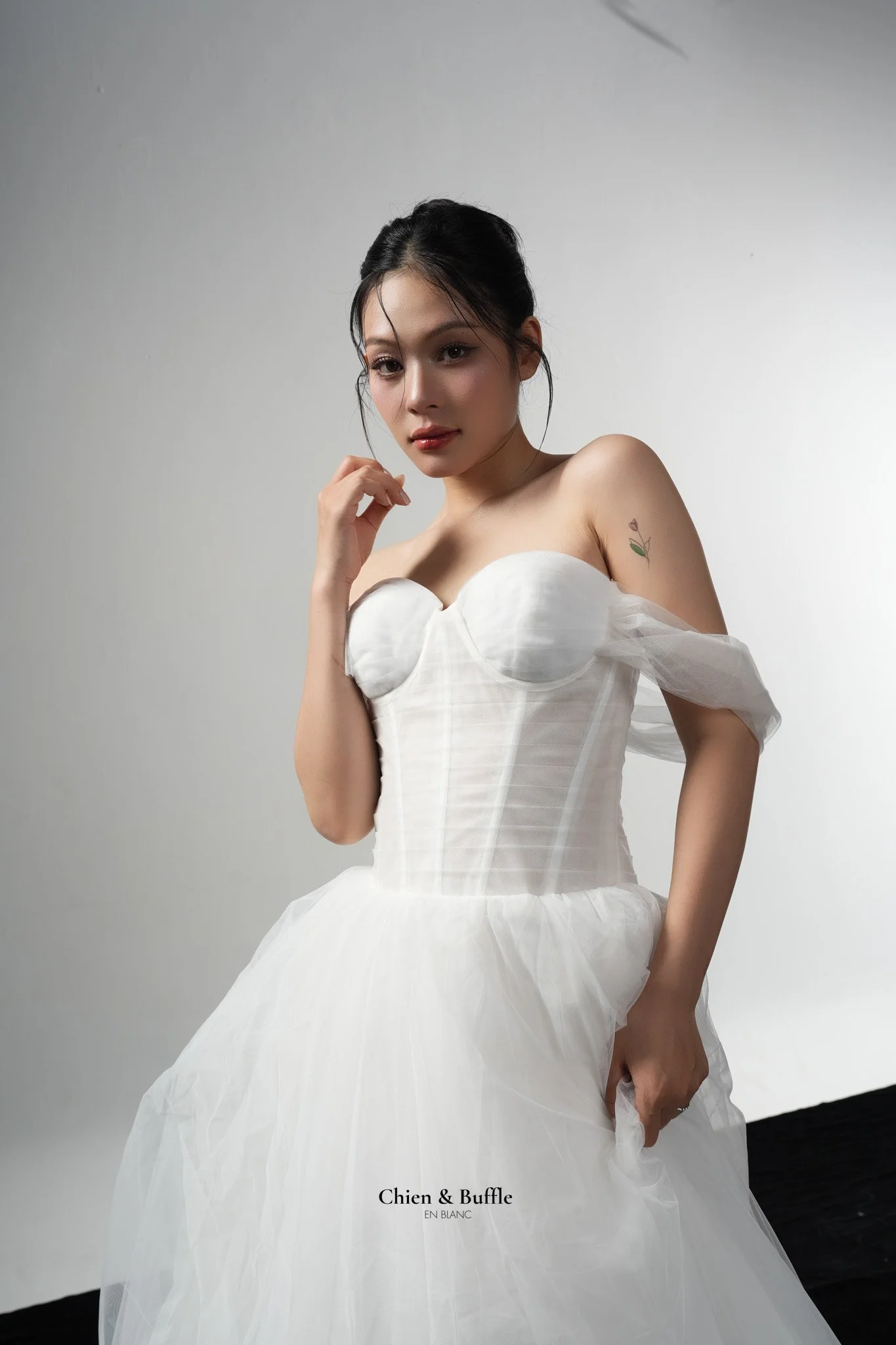 Description: The Arielle Bridal Dress is a romantic and modern gown that beautifully combines structure with ethereal softness. The dress features a visible corset-style bodice, which provides a modern and defined silhouette. A delicate sheer tulle overlay drapes gracefully over the bodice and bust, forming romantic off-the-shoulder straps. The A-line skirt is composed of layers of soft sheer tulle that flow effortlessly, creating a dreamy and graceful movement. This gown is perfect for a bride who wants a blend of contemporary structure and timeless, romantic elegance.