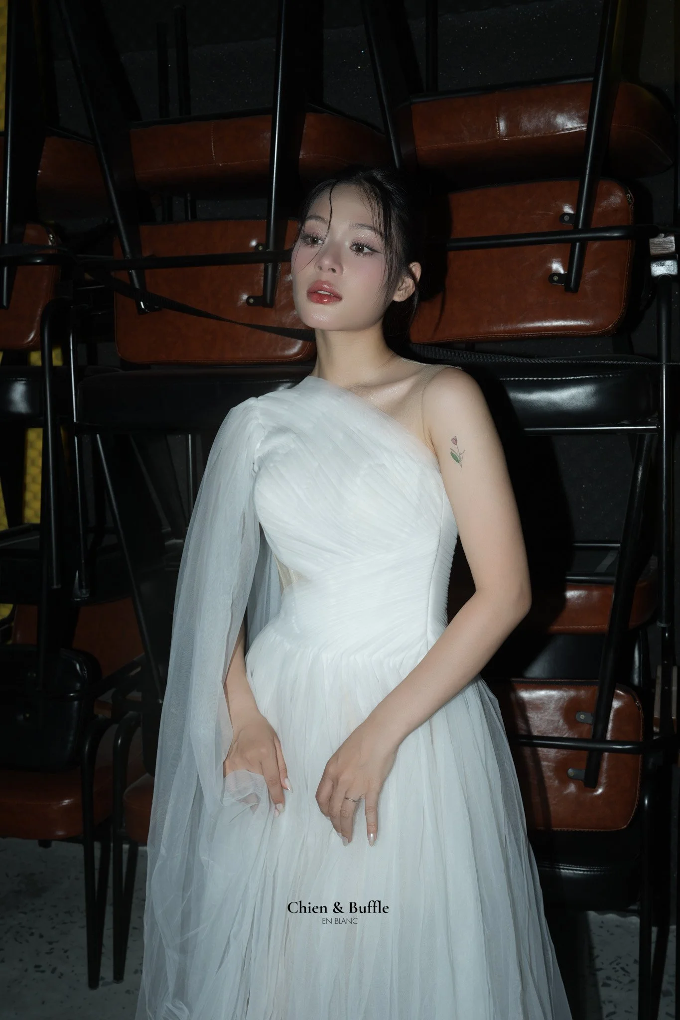 Details: Asymmetrical one-shoulder design with a draped bodice and a flowing A-line skirt. A delicate sheer tulle cape flows from the single shoulder, creating a romantic and ethereal touch.